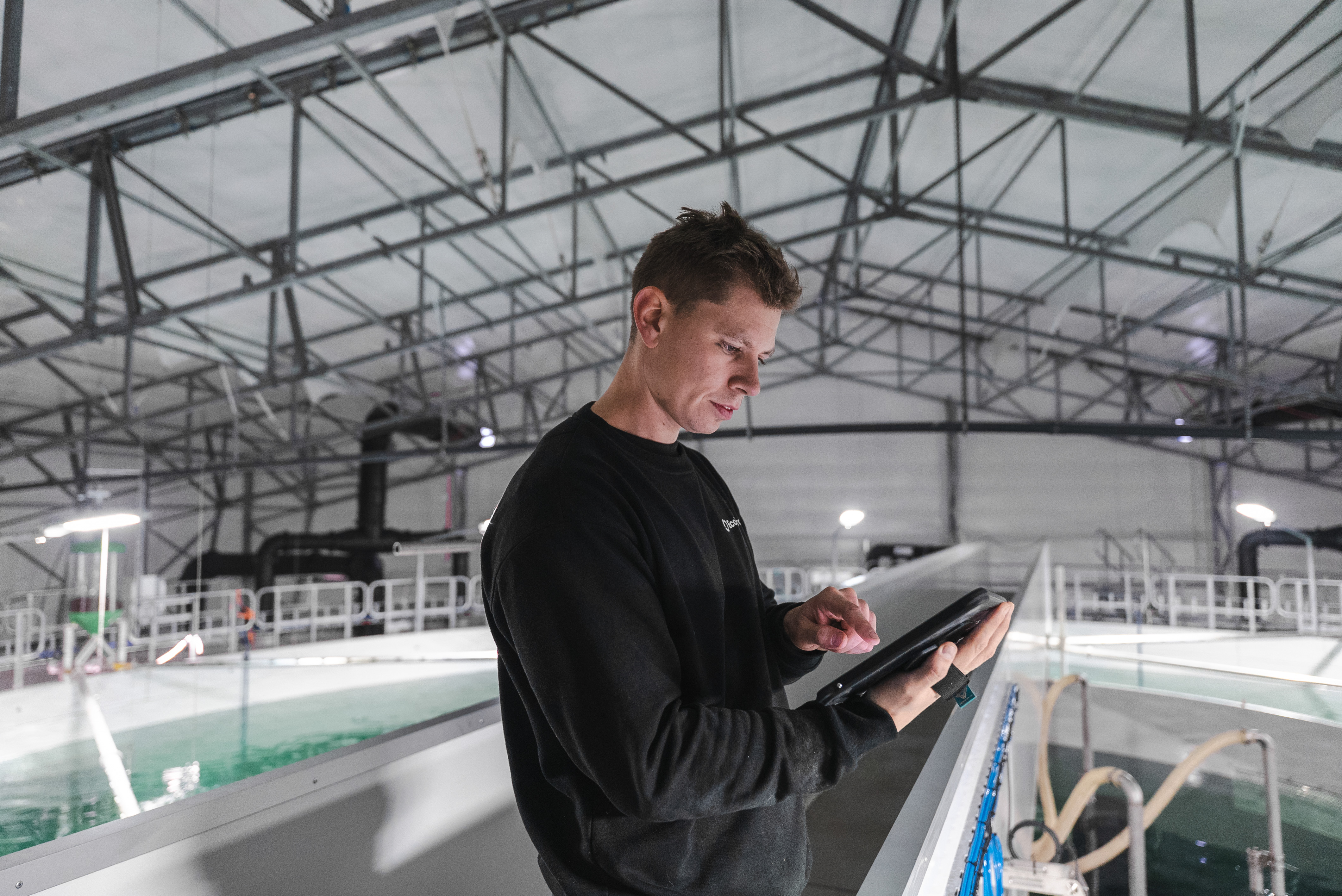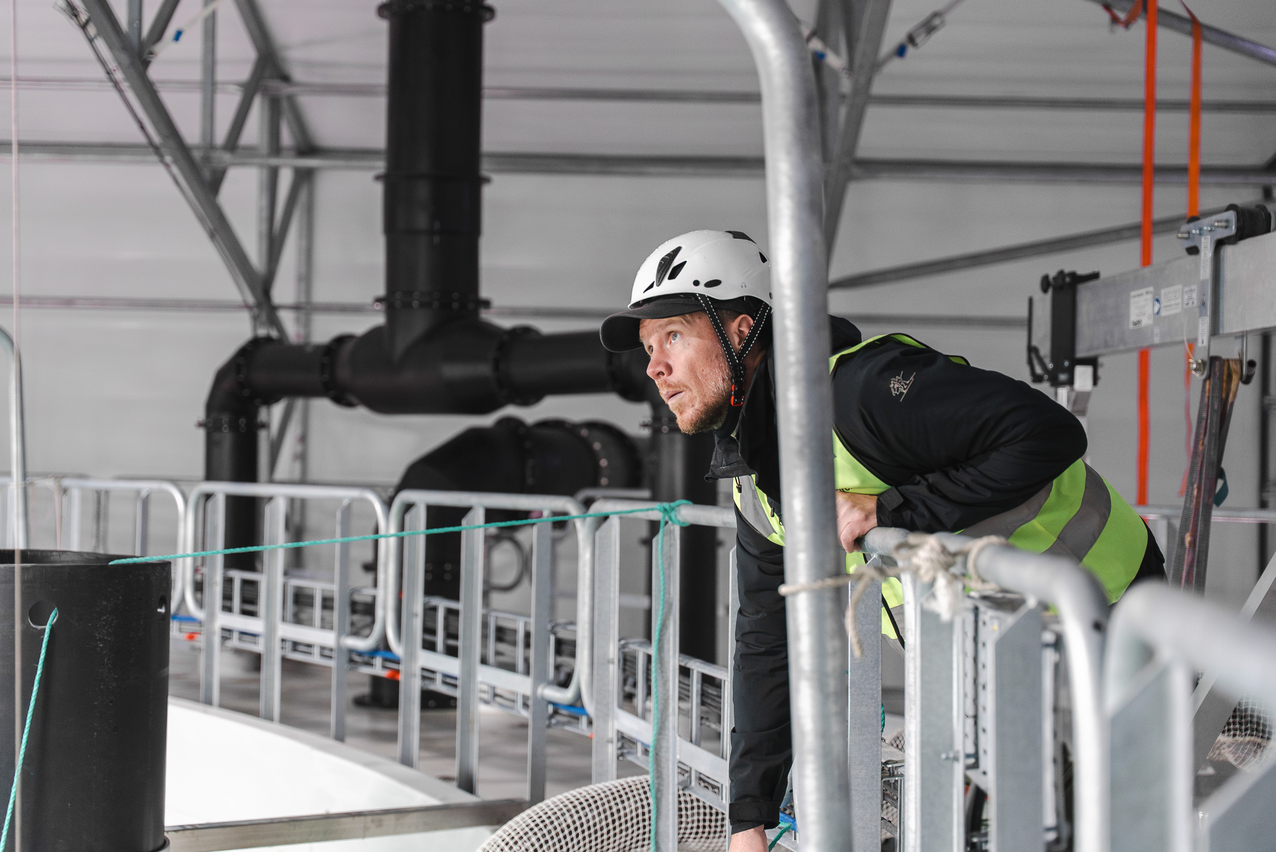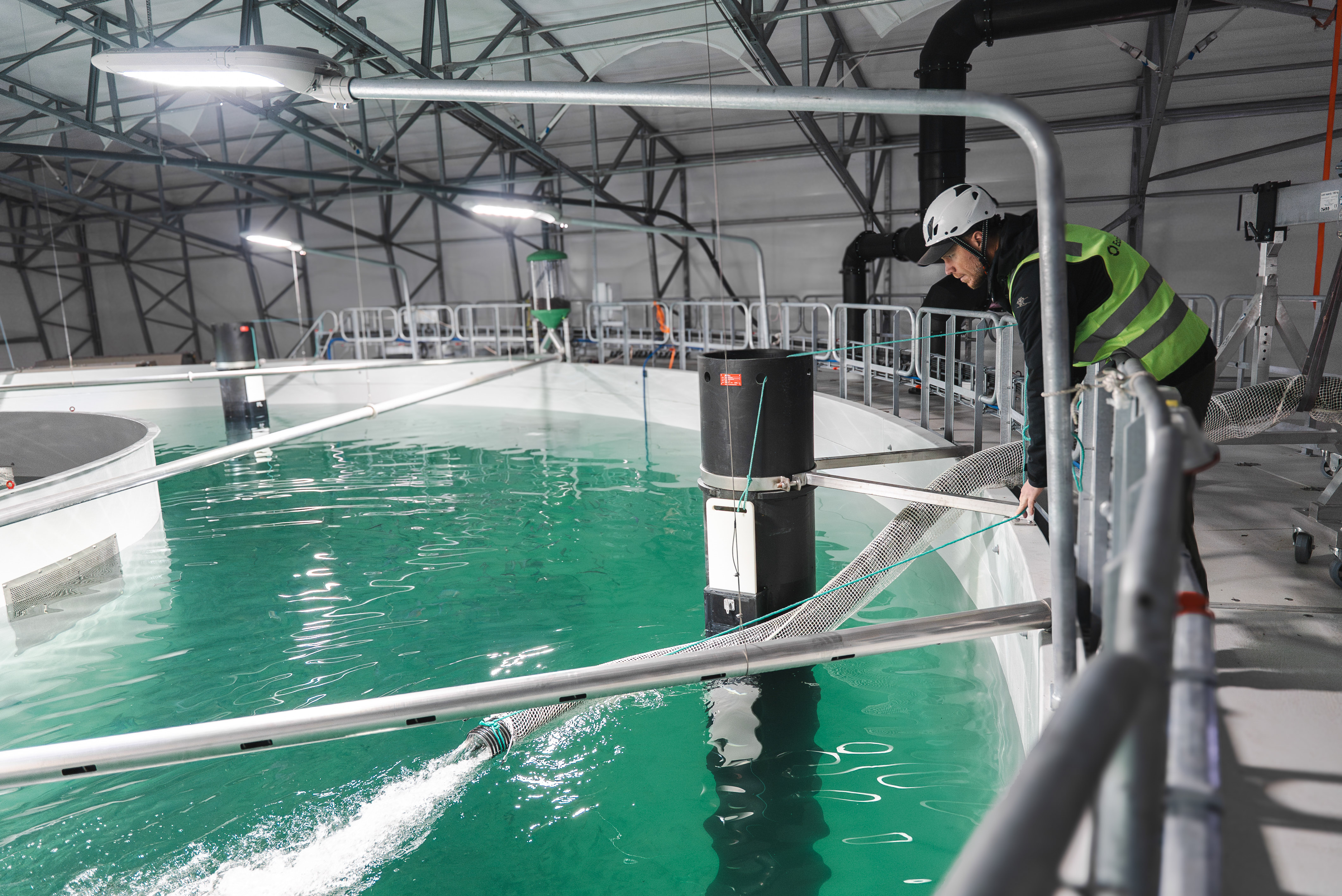 Inne i hallen er det rolig. Vannet går jevnt i tankene, med tydelig strøm. Folk jobber konsentrert, uten høyt tempo eller unødvendige bevegelser. Det er ikke fordi lite skjer, men fordi systemene gjør jobben sin.