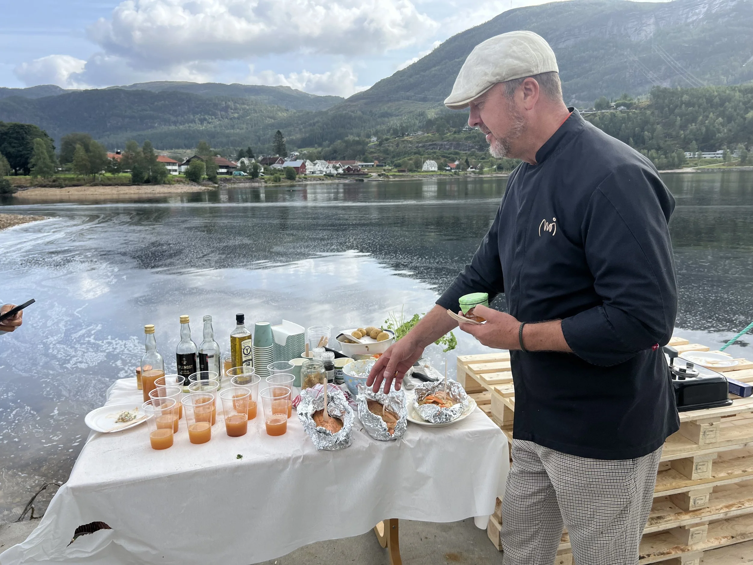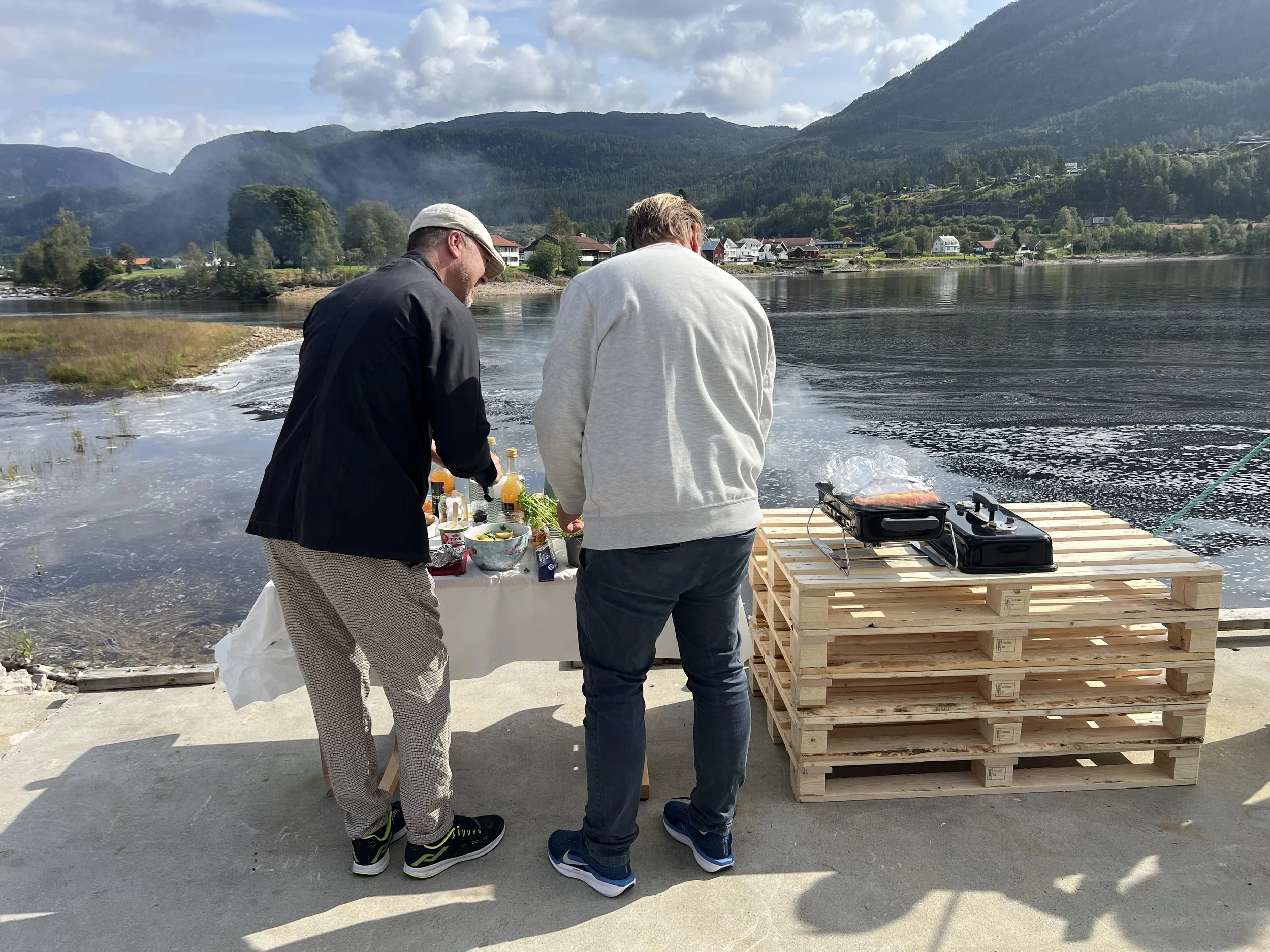 Første støpp var hos Norsk Ørret AS på Tonstad hvor produksjonsprosessen fra yngel til levering på egen slaktetrailer ble presentert og gjestene fikk møte den flotte ørreten ute på anlegget i Sirdalsvatnet. Tidlig samme morgen gikk 4-5 tonn ørret til slakteriet i Mandal og for å gi deltagerne et møte med den flotte Sirdalsørreten overrasket vertskapet sine gjester da de kom i land etter omvisning ute på merdene. Andreas Lindhom og Vidar Birkeland hadde gjort klar nødvendige ingredienser for tidenes lunsj på brygga. Eplegelé og eplejuice fra Røyland Gård ble lagt til og med kyndige kokkehender ble det servert den mest fantastiske lunsjen rett fra grill til gjester og vertskap. Kokkene delte villig tips og triks for den gode smaken: