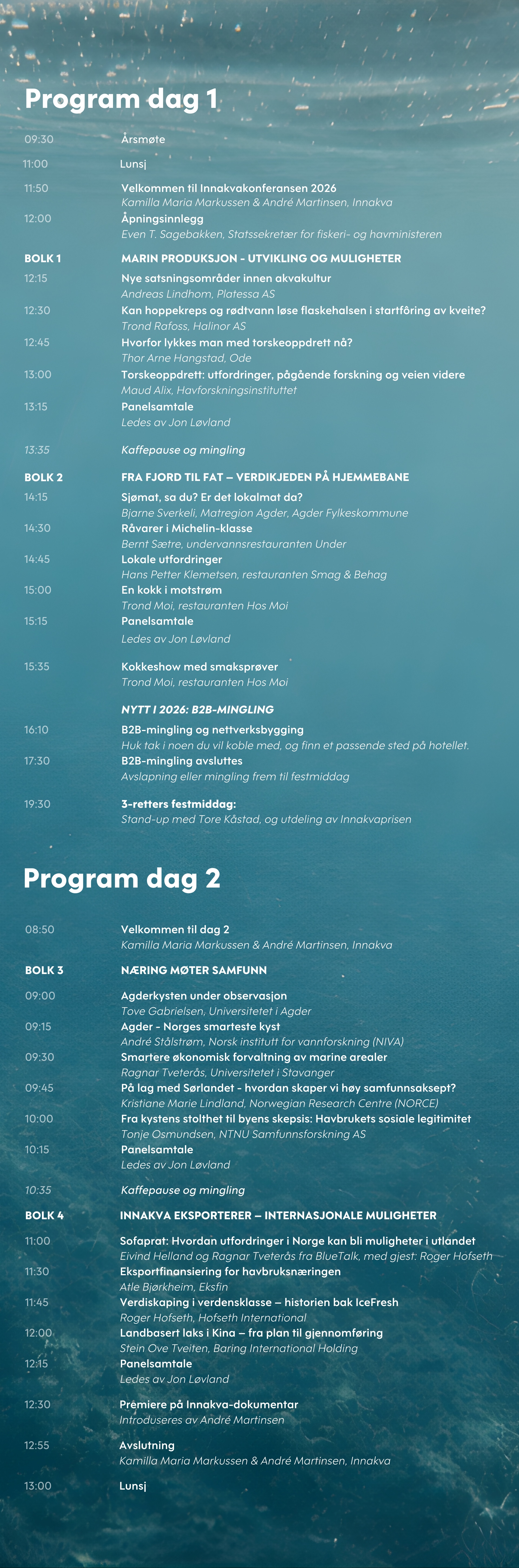 To dager med faglig påfyll, gode samtaler og møte mellom folk som jobber i og rundt blå næring. Programmet spenner bredt, fra marin produksjon, teknologi og fiskevelferd, til mat, opplevelser og eksport.