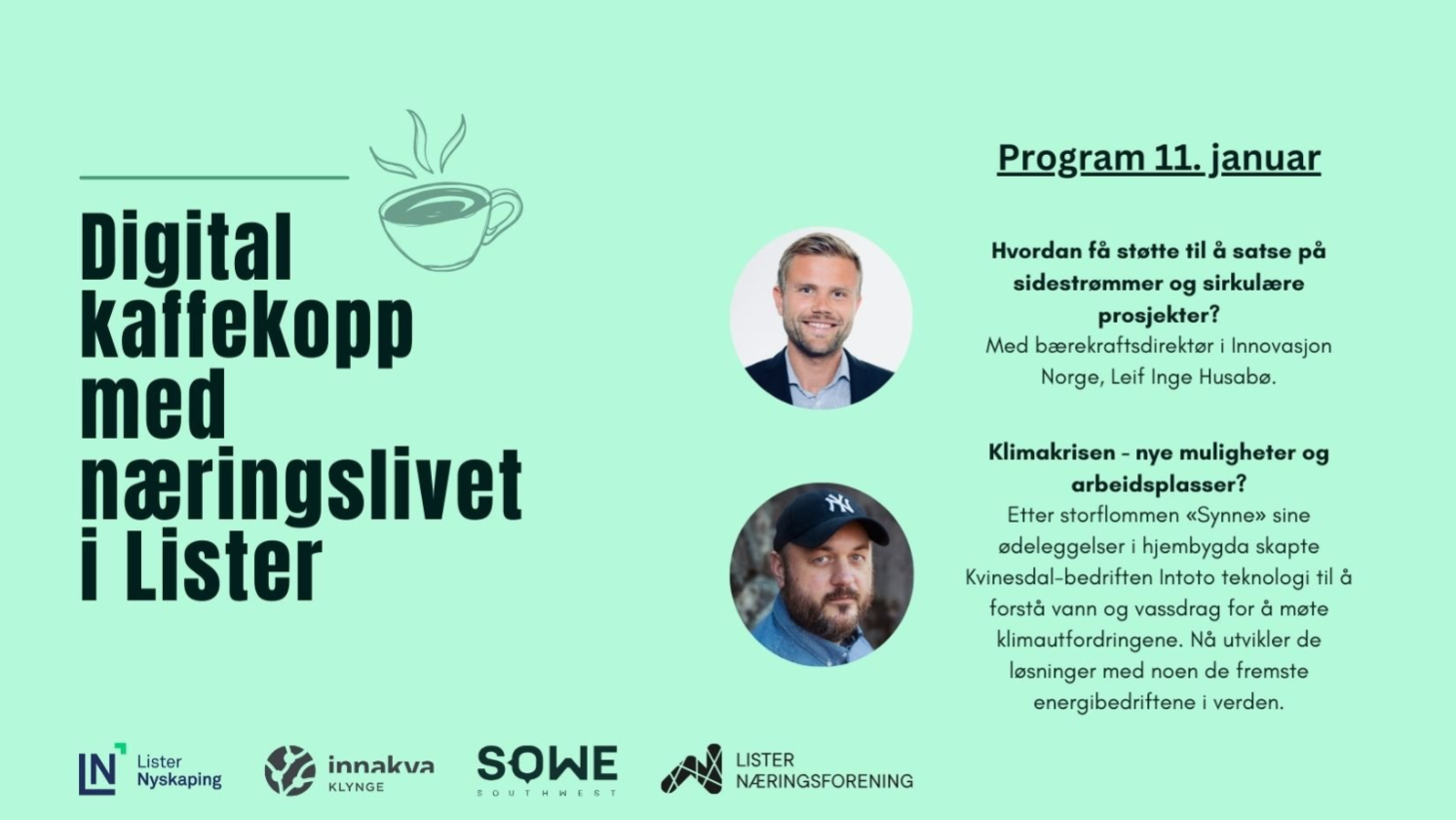 Neste gang har vi fått med oss bærekraftsdirektør i Innovasjon Norge, Leif Inge Husabø. I tillegg kommer Kvinesdal-bedriften og klyngedeltager Intoto. Etter storflommen «Synne» sine ødeleggelser i hjembygda skapte de tre gründerne teknologi til å forstå vann og vassdrag for å møte klimautfordringene. Nå utvikler de løsninger med noen av de fremste energibedriftene i verden.