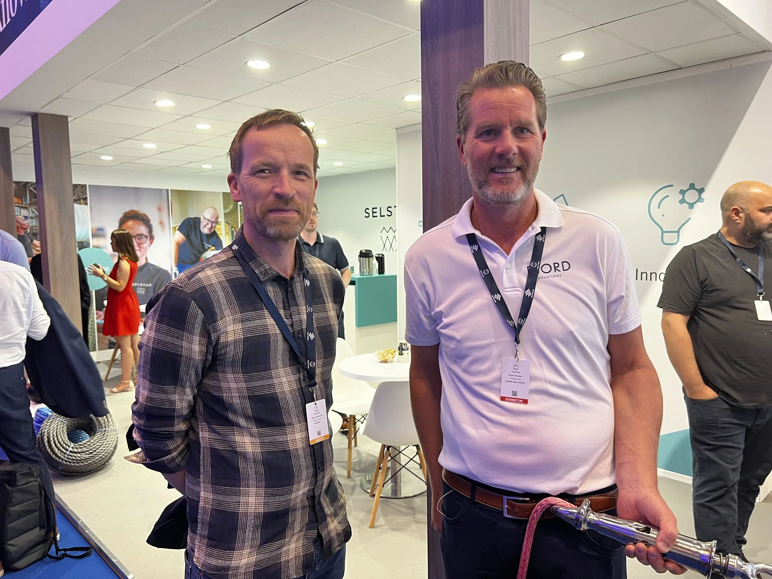 Messen byr på møter med både kjente samarbeidspartnere og uendelige muligheter for nye kontakter og forretningsmuligheter. Styreleder i Innakva KLYNGE og Baring Farsund profil Bjarte Sævareid i samtale med Bjørn Drønen i Fjord Solutions som stolt viser frem deres patenterte Aqualock-løsning.
