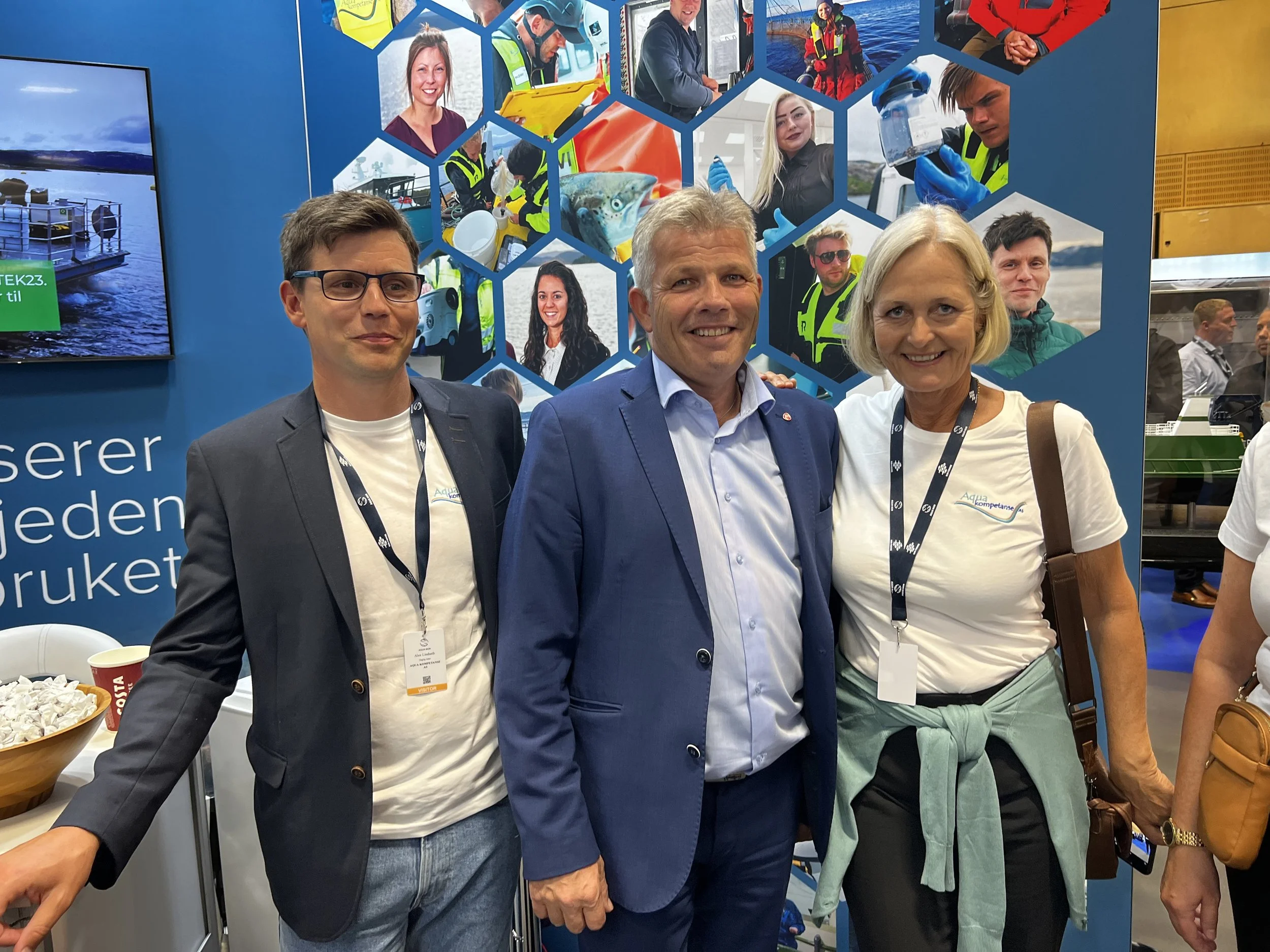 Fv.: Alex Lindseth, daglig leder Aqua Kompetanse, Fiskeriminister Bjørnar Skjæran og Anne Lene Dale, regiondirektør Sør i Aqua Kompetanse (Arendal).