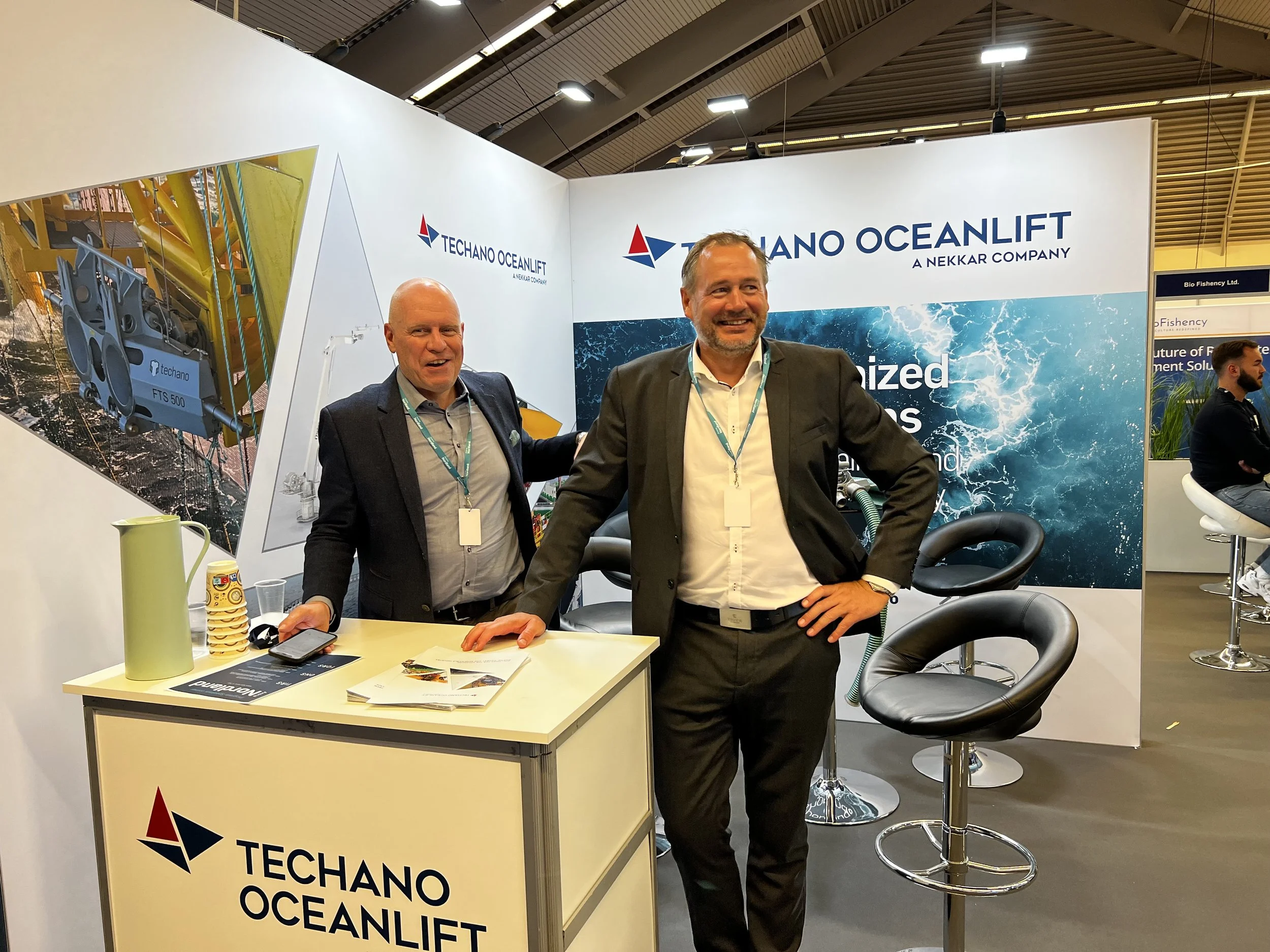 Øystein Bondevik (t.h) står i spissen når Techano-produktene vises frem på messen. Techano Oceanlift er et Nekkar-selskap og de viste også frem Nekkar’s lukket merd kalt “Starfish”til de besøkende. Undertegnede kan også bekrefte at serveringen på Norland’s stand var upåklagelig…